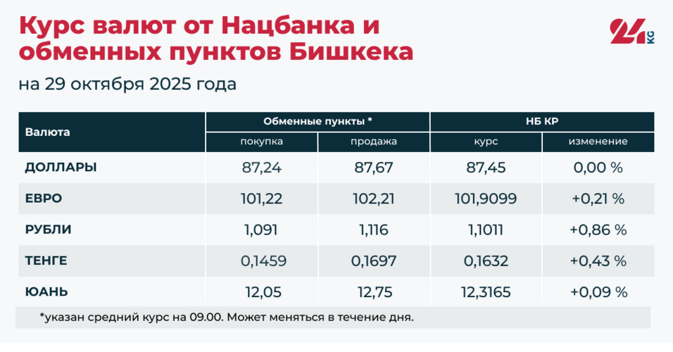 • Средний курс в обменных пунктах: покупка — 87,24 сома, продажа — 87,67 сома.