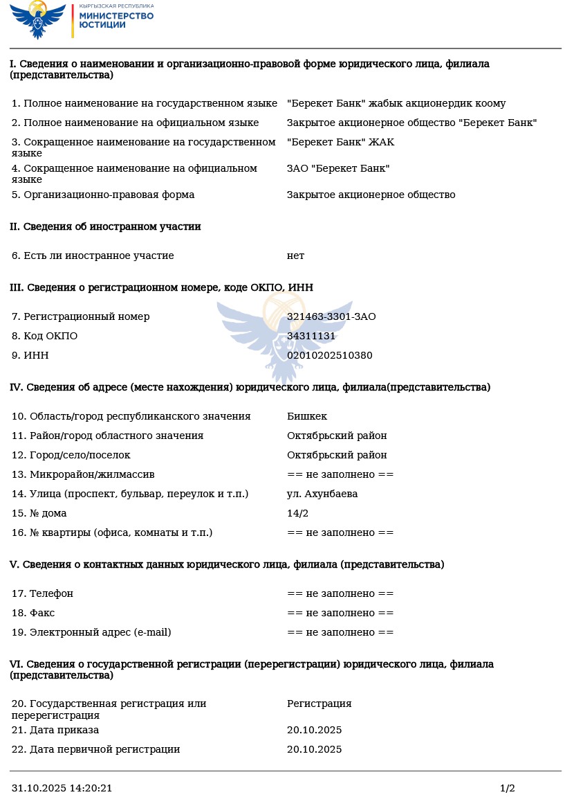 Решение о выдаче разрешения на создание финансовой организации принято правлением регулятора 10 октября 2025 года. Как следует из данных Министерства юстиции, банк зарегистрирован 20 октября в форме закрытого акционерного общества без иностранного участия.