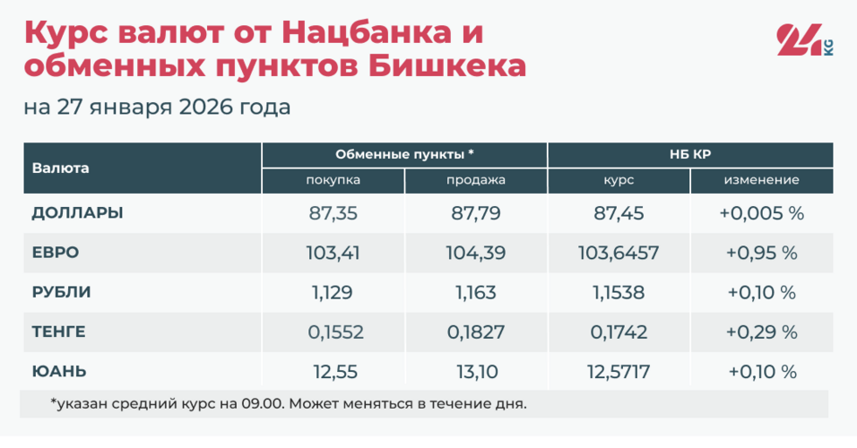 - Официальный курс НБ КР: 87,45 сома (рост на 0,005 процента).