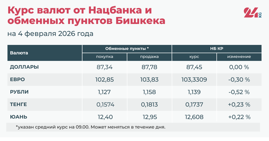 • Средний курс в обменных пунктах: покупка — 87,34 сома, продажа — 87,78 сома.