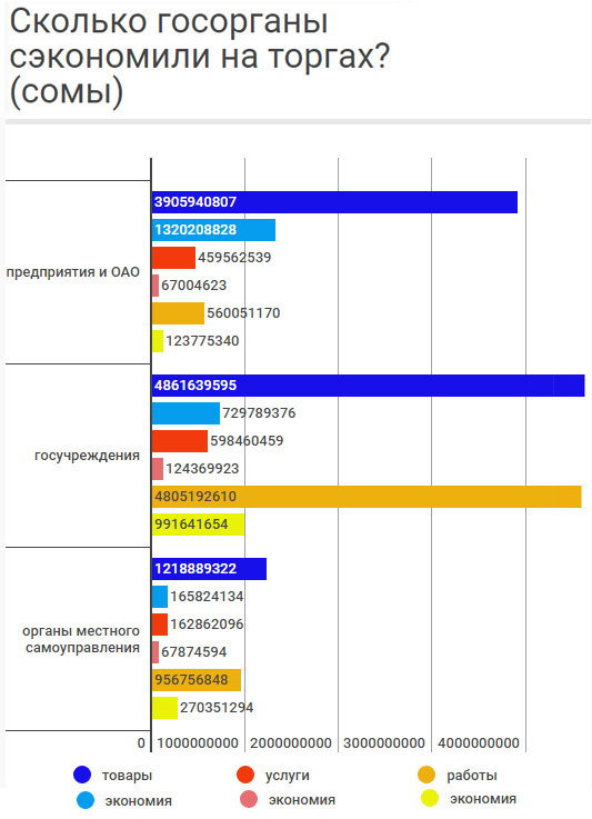 С другой стороны, благодаря закупкам государство экономит бюджетные средства. За полгода состоялось 14 тысяч 402 тендера - на 12 миллиардов 603 миллиона сомов. За счет торгов сэкономили 2 миллиарда 349,8 миллиона.