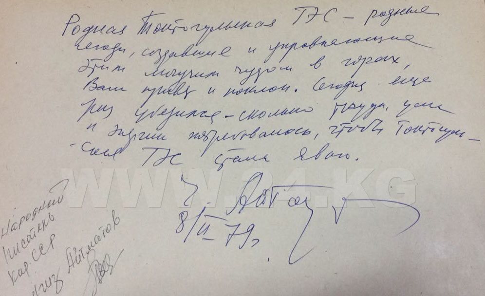 Несколько раз приезжал на Токтогулку и Чингиз Айтматов. Писатель оставил в книге посетителей пожелания работникам станции.