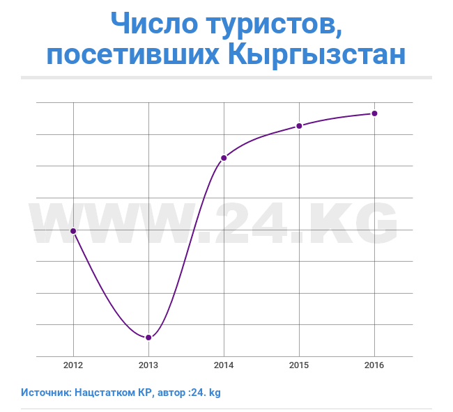 Отмечается, что Кыргызстан в 2016 году посетили 1 миллион 273 тысячи туристов. Доходы от приема иностранных граждан оцениваются в $415,6 миллиона (по сравнению с 2015 годом увеличились на 1,4 процента). Число туристов выросло на 8 тысяч. В основном в 2016 году приезжали на отдых в Кыргызстан туристы из Казахстана, России, Таджикистана, Узбекистана, Германии, Турции, Китая и США.