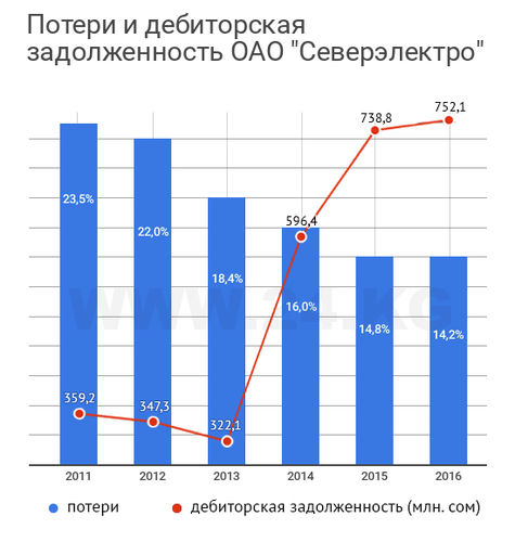 Более стабильные данные в «Ошэлектро». Снизив потери с 19,9 до 13 процентов, распредкомпания сохранила дебиторскую задолженность на уровне 400 миллионов сомов. За 5 лет она выросла лишь на 55 миллионов сомов.