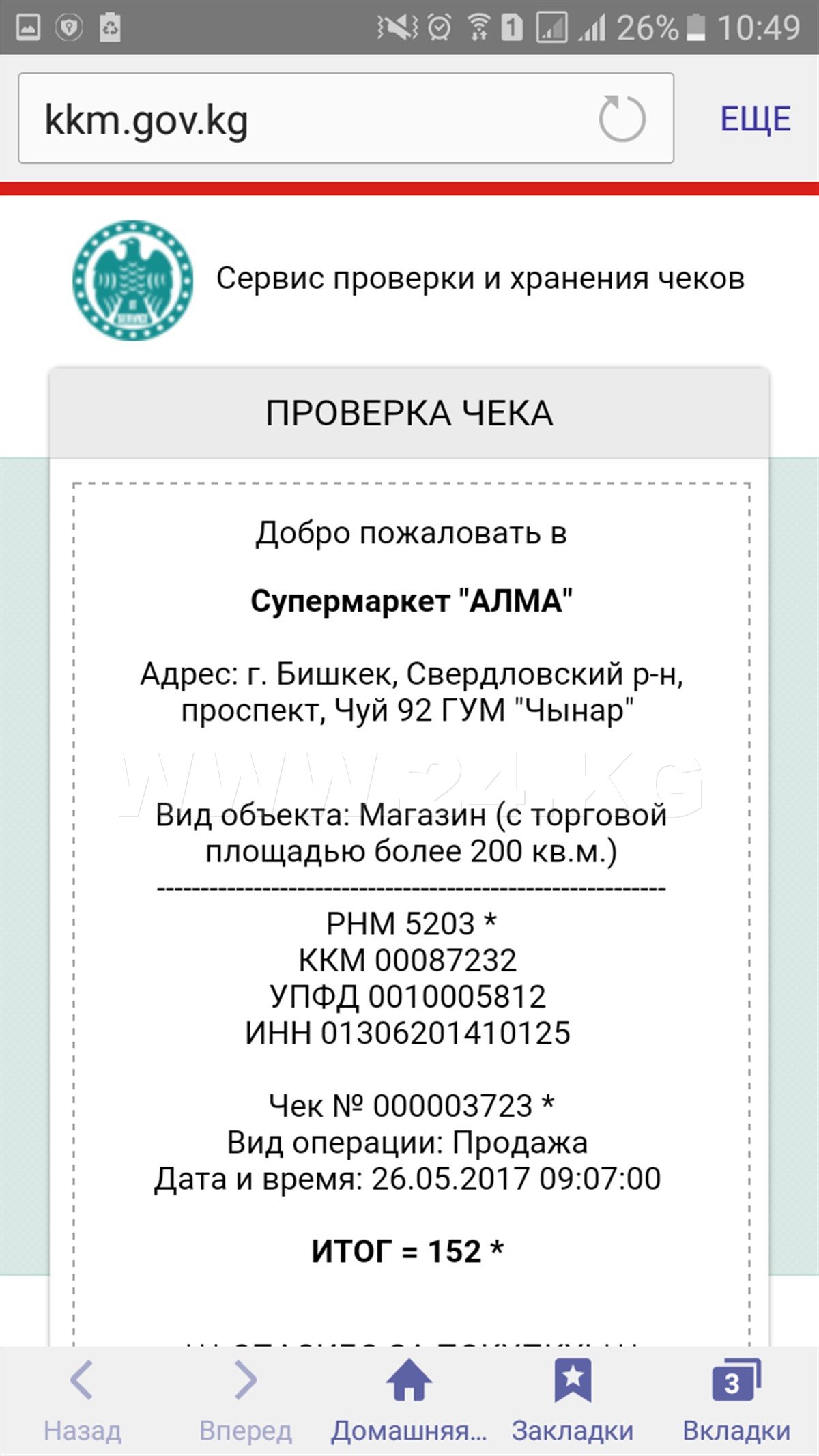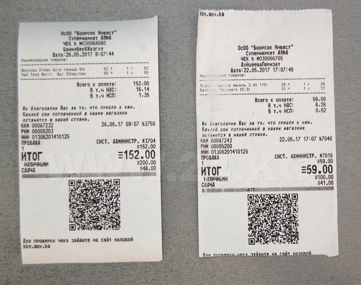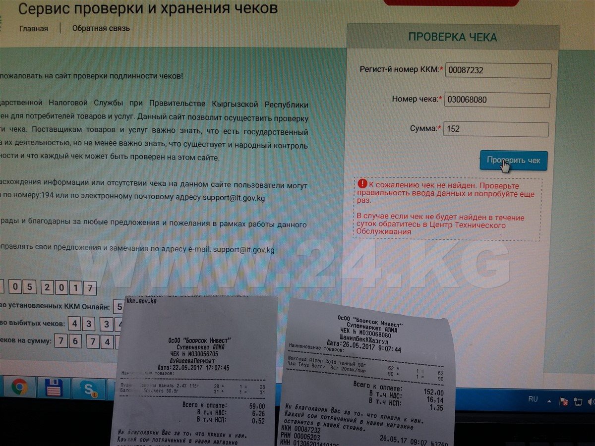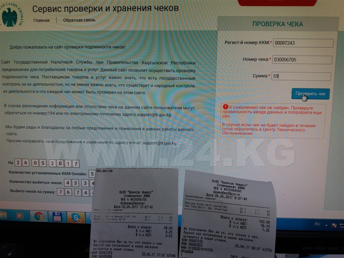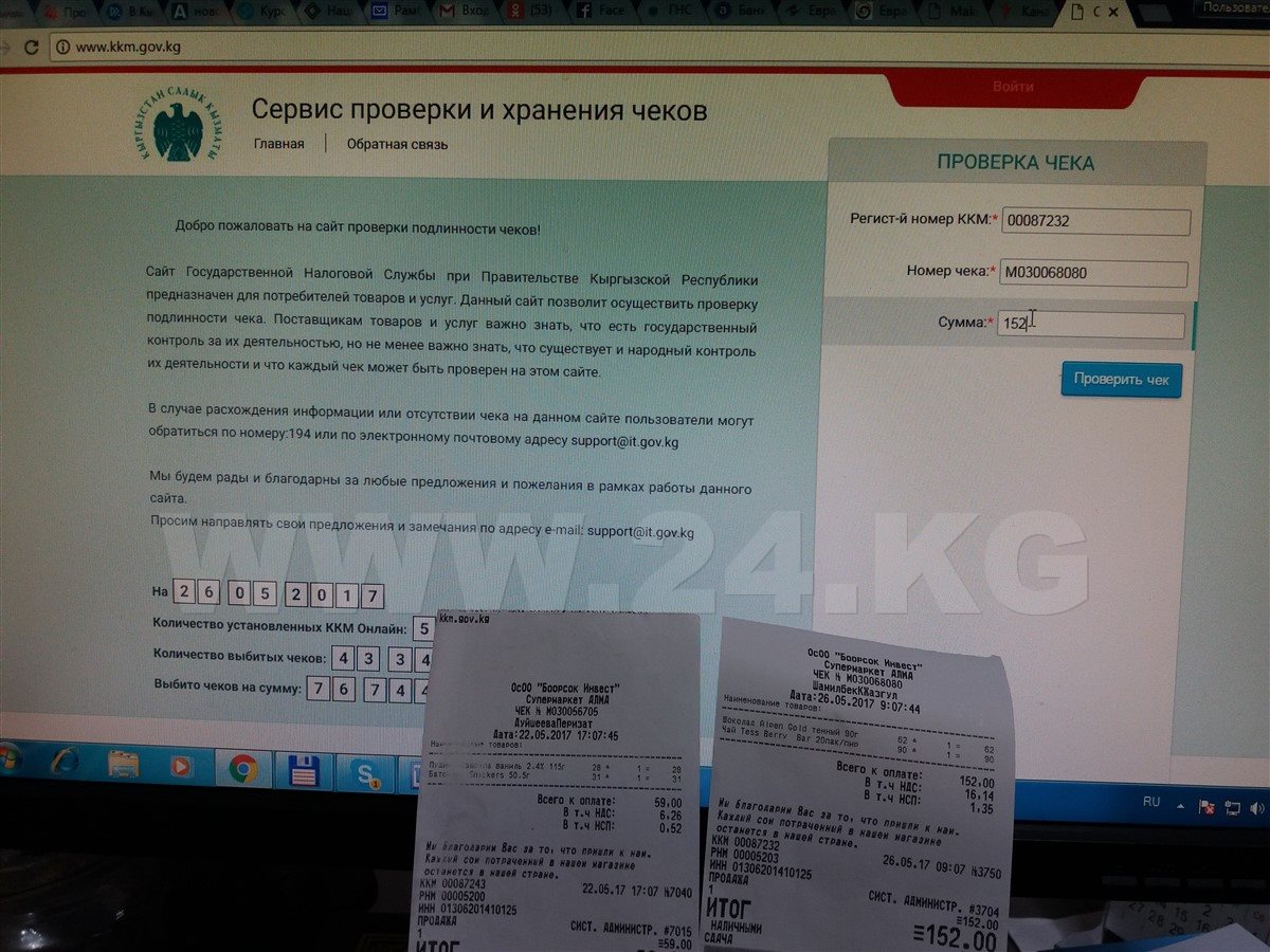 Чтобы проверить достоверность с компьютера, нужно зайти на сайт — www.kkm.gov.kg. В специальных полях следует пробить регистрационный номер контрольно-кассовой машины, номер чека и сумму, указанную на чеке. На этом же сайте можно проследить количество модернизированных (установленных) ККМ, количество и сумму выбитых чеков. Данные обновляются каждые 10 секунд.