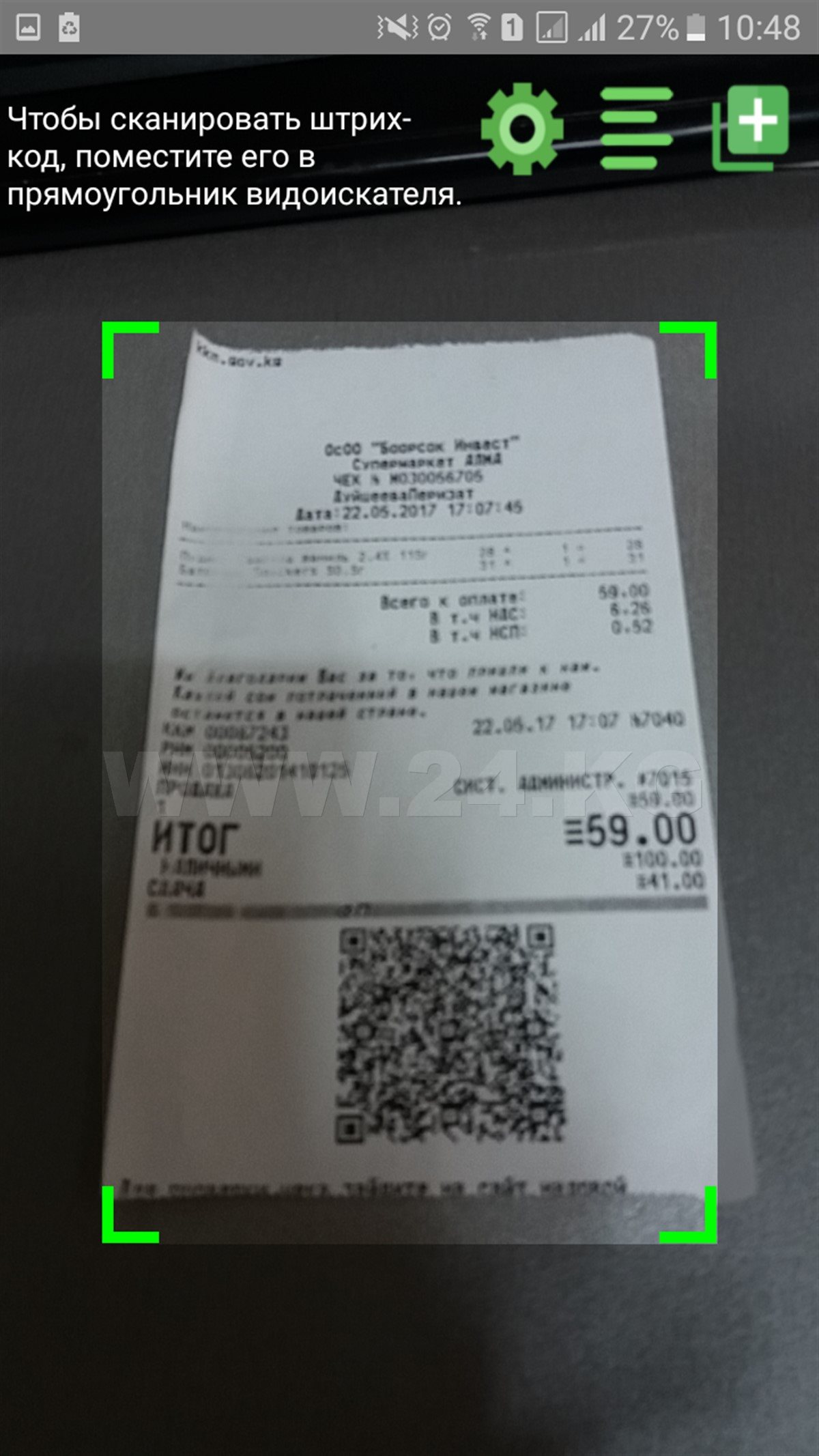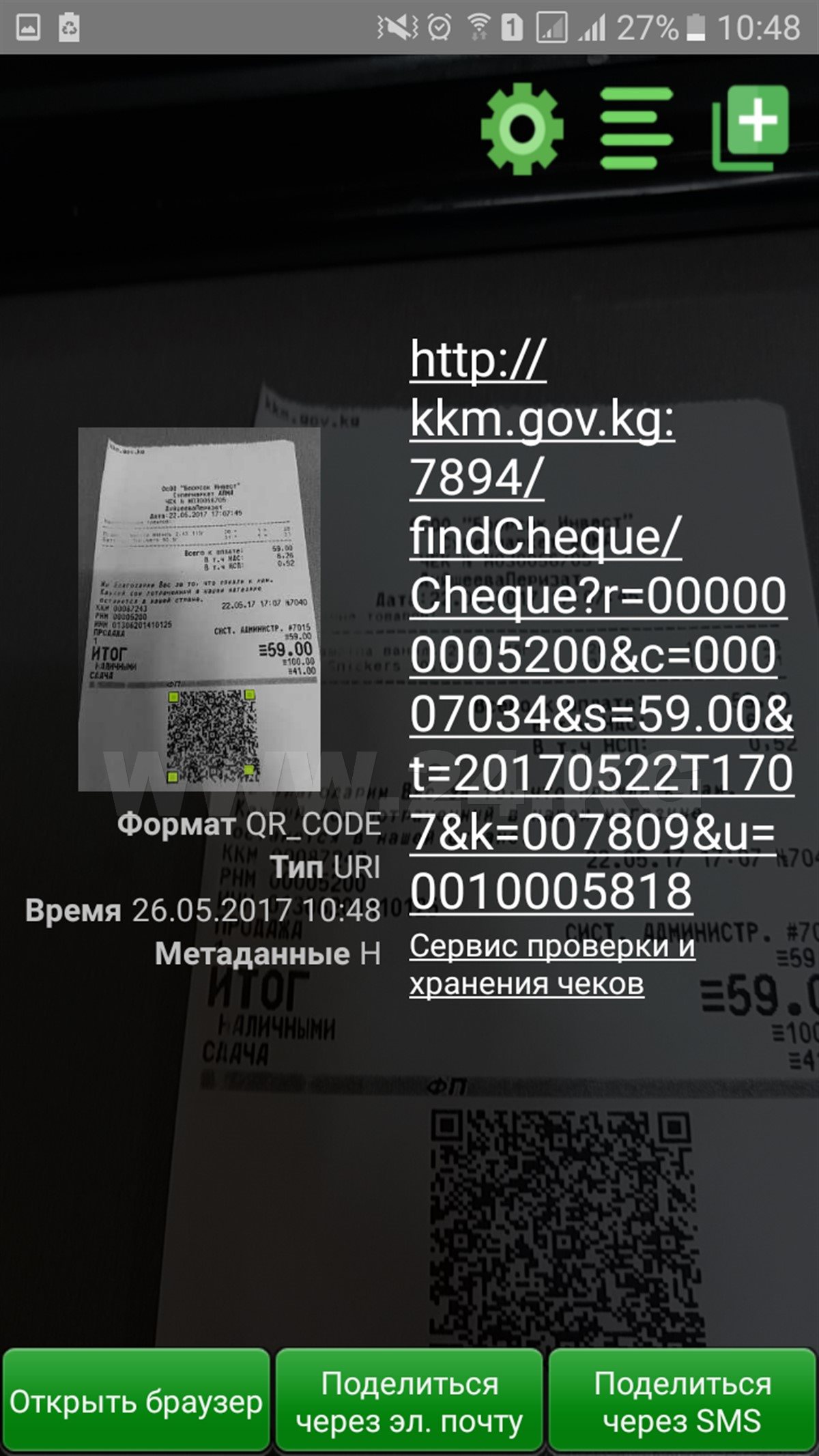 Второй способ проверки чека более современный — через смартфон. Необходимо скачать мобильное приложение «Сканер штрих-кодов» на смартфон через Play Market либо «QR Scanner» на App Store. С помощью этого приложения распознается код, и система автоматически предлагает перейти на сайт ГНС, где показаны все условия покупки.