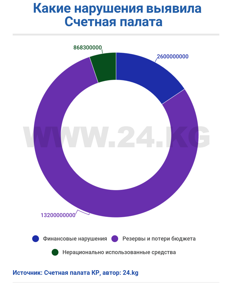 По его словам, из выявленных нарушений возмещению подлежат 4,1 миллиарда сомов. В бюджет уже вернули 3,2 миллиарда сомов, или 78 процентов от суммы. В 2015 году выявлено нарушений на 13,6 миллиарда сомов. Возмещению подлежало 2 миллиарда сомов, вернули 1,5 миллиарда, или 75 процентов.
