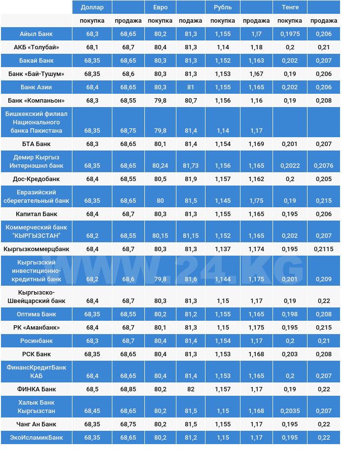 Курс доллара в коммерческих банках Кыргызстана на 24 августа