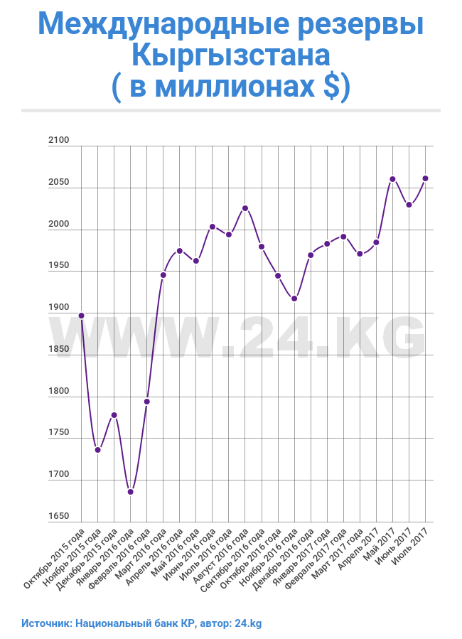 По итогам июля валовые международные резервы Кыргызстана выросли на $32,65 миллиона. Такие данные приводит Национальный банк.