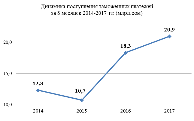 Уточняется, что по сравнению с аналогичным периодом 2016 года поступление таможенных платежей увеличилось на 2,6 миллиарда сомов, или на 14,3 процента.