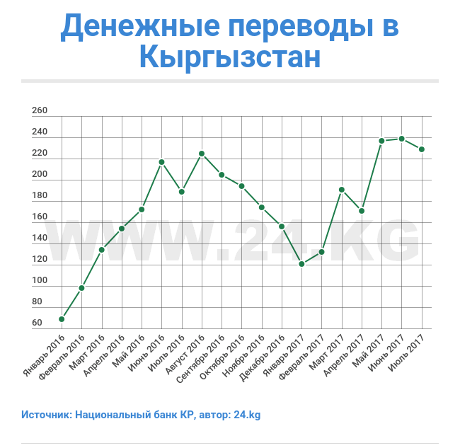 Отмечается, что за июль чистый приток денежных переводов сложился в сумме $228,8 миллиона. За месяц объем переводов сократился на $10 миллионов. При этом львиную долю занимают переводы из России — $225,1 миллиона. За семь месяцев из этой страны переведено $1 миллиард 294,8 миллиона.