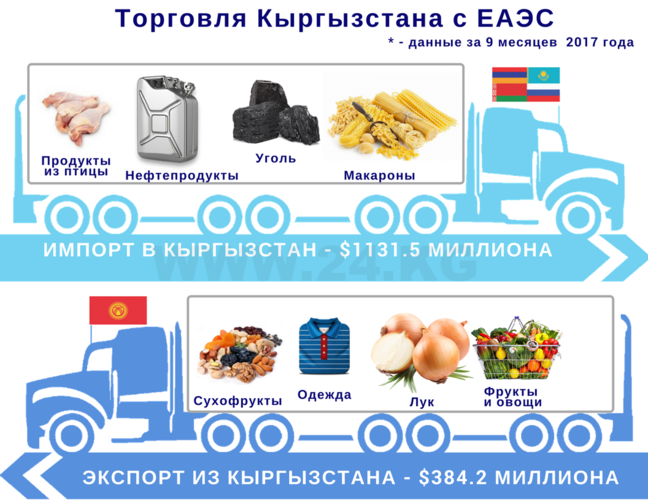 С государствами Евразийского экономического союза мы наторговали на $1 миллиард 515,7 миллиона. Это на 13,7 процента больше, чем в прошлом году, но на 21 процент меньше показателя 2015-го, когда Кыргызстан еще не был полноправным членом союза.