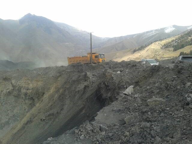Дорога, по которой мы добирались до месторождения, от въезда в Нарынскую область оказалась совершенно разбитой. По ее краям асфальта практически нет. Под колесами большегрузных машин он уже превратился в крошку. А сохранившаяся посередине узкая полоса асфальта сплошь в ямах. Так, трясясь, ехали несколько часов до самого разреза, обгоняя пустые грузовики, направляющиеся за углем. Обгонять их было непросто, потому что впереди идущая машина поднимала такую пыль, что не было видно, свободна ли встречная полоса. А навстречу один за другим тянулись груженые грязные самосвалы.