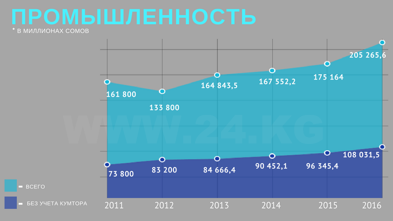 Драйвером промышленного роста остается крупнейшее месторождение золота в стране — Кумтор. Без его учета показатели весьма скромные. Да, они понемногу растут, но совсем не теми темпами, которые нужны для развития отрасли. К тому же традиционно хорошие показатели в добыче металлических руд, производстве основных металлов, очищенных и минеральных нефтепродуктов.
