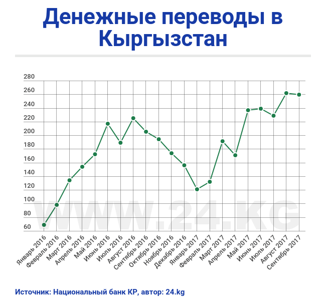 За девять месяцев 2017 года из страны перечислено $316,2 миллиона. Таким образом, чистый приток денежных переводов в Кыргызстан сложился в сумме $1 миллиард 424,3 миллиона.