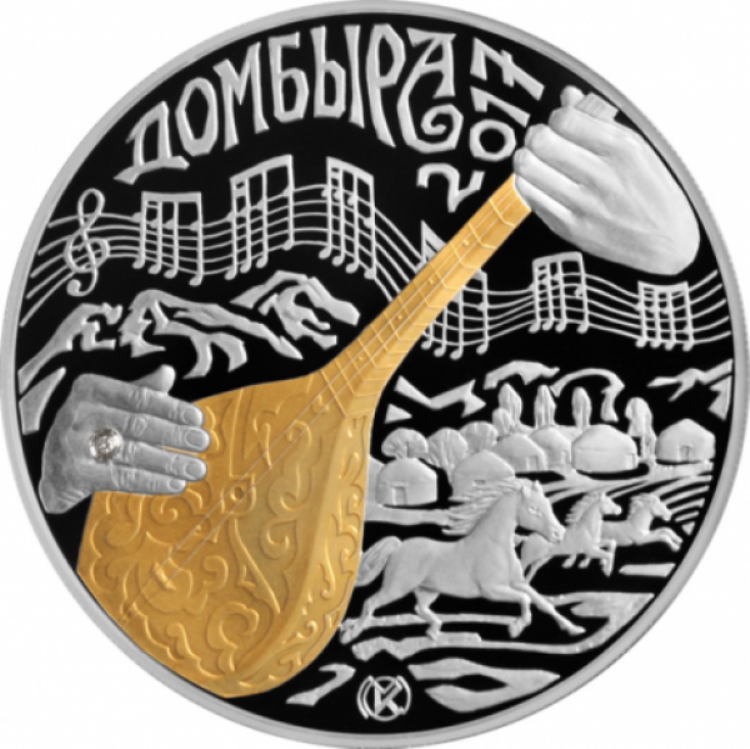 На оборотной стороне (реверсе) монеты изображен фрагмент игры на домбре на фоне стилизованных изображений гор, казахского поселения, степи, скакунов, нотного стана с фрагментом музыкального произведения для домбры. Отмечается, что монета инкрустирована бриллиантом. Цветовое решение выполняется посредством золочения.