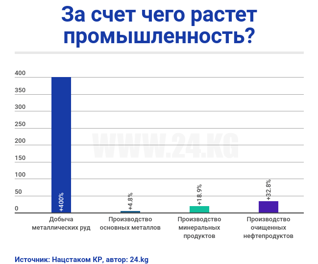 Промышленность по итогам 11 месяцев также демонстрирует рост. Объем производства оценивается в 204 миллиарда сомов с ростом на 12,5 процента по сравнению с аналогичным периодом 2016-го.