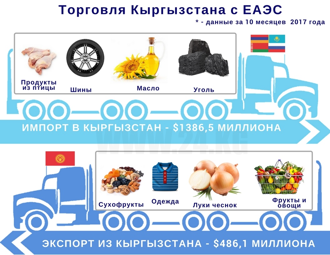 Анализ динамики торговли Кыргызстана со странами ЕАЭС показал увеличение экспорта и значительное уменьшение импорта. Так, экспорт в страны союза оценивается в $486,1 миллиона. Это на 26,8 процента больше, чем в 2016-м.
