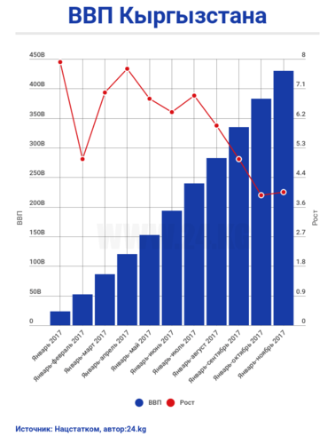 По итогам ноября ВВП Кыргызстана составил 430,1 миллиарда сомов. По сравнению с аналогичным периодом 2016-го показатель вырос на 4 процента.