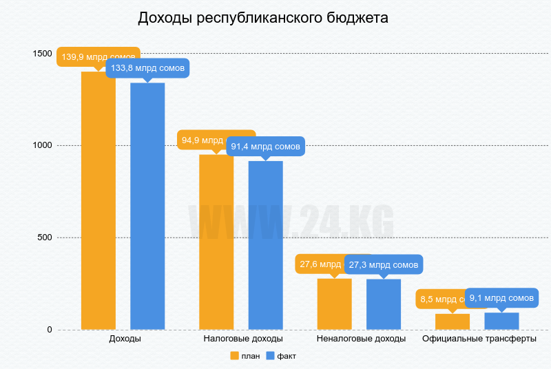 По предварительным данным Центрального казначейства, за январь-декабрь 2017 года в республиканский бюджет поступило 140 миллиардов 4,2 миллиона сомов. Об этом сообщили в Министерстве финансов Кыргызстана.