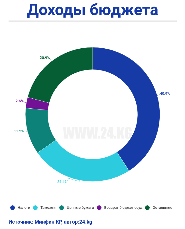 Основную часть доходов составляют налоговые поступления — 91 миллиард 462,8 миллиона сомов. Это на 9 миллиардов 977,1 миллиона больше, чем в 2016 году. При этом от уплаты налогов и сборов бюджет пополнился на 57 миллиардов 282,9 миллиона сомов, от таможенных сборов — на 34 миллиарда 179,9 миллиона сомов.