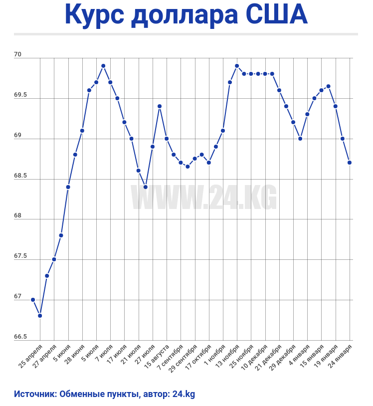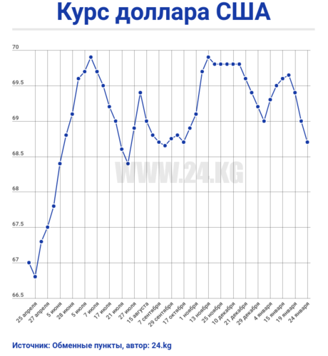 Сегодня обменные пункты столицы и коммерческие банки покупают доллар по 68,25-68,45 сома, а продают — по 68,65-68,8 сома. Номинальный курс — в 68,6956 сома (падение за сутки — на 0,93 процента).