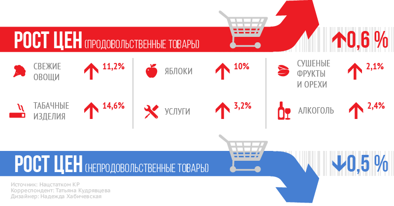 С начала года рост цен и тарифов составил 1,1 процента. Наибольшее с начала года подорожание (3,2 процента) зафиксировали в Нарынской области, тогда как в Баткенской отмечено снижение на 1,7 процента.