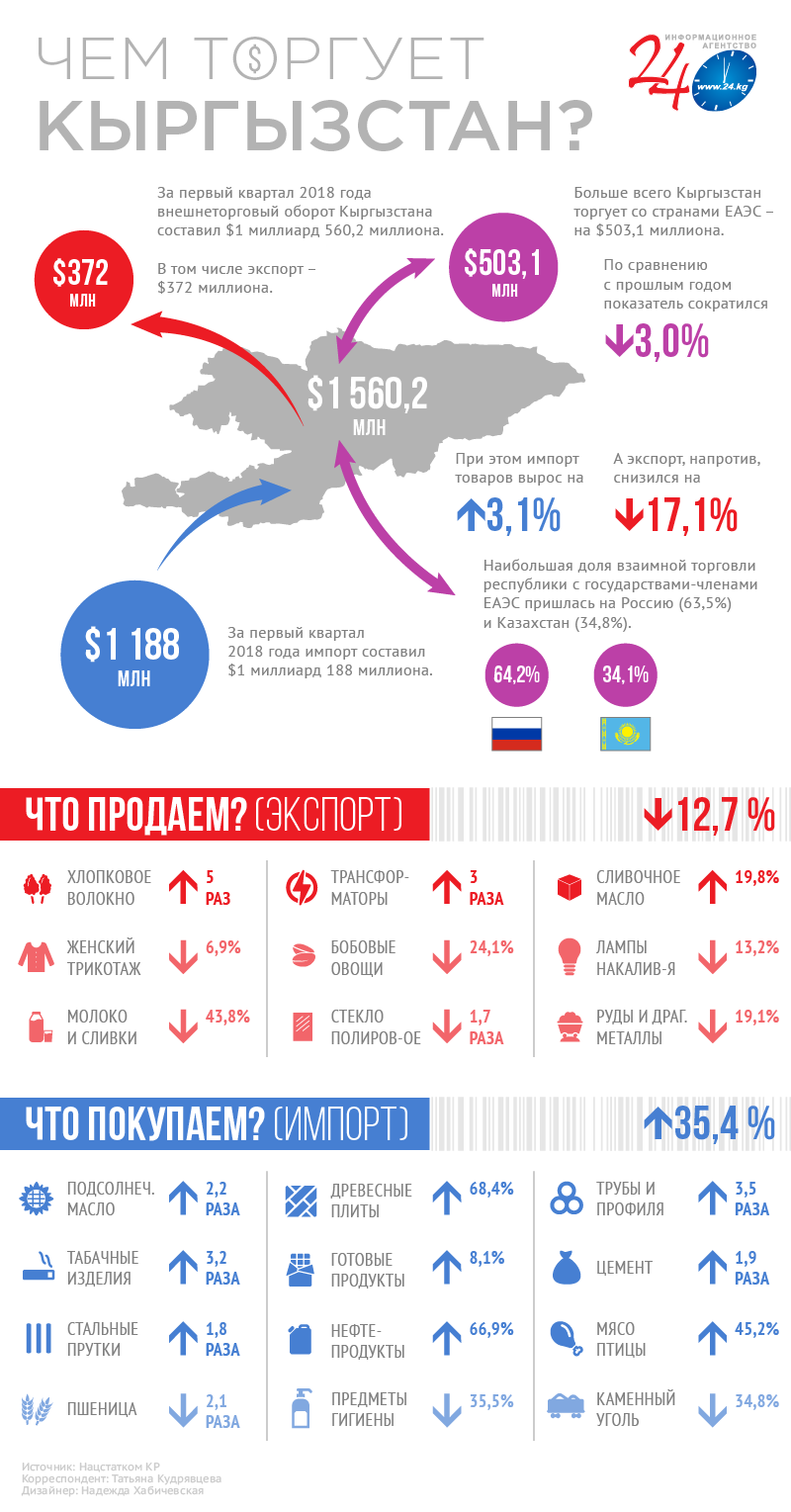 По итогам января-апреля 2018 года рост ВВП республики составил 132,6 миллиарда сомов. По сравнению с аналогичным периодом 2017-го показатель вырос на 1,3 процента. Отметим, что такой же рост экономика показала и в первом квартале года.