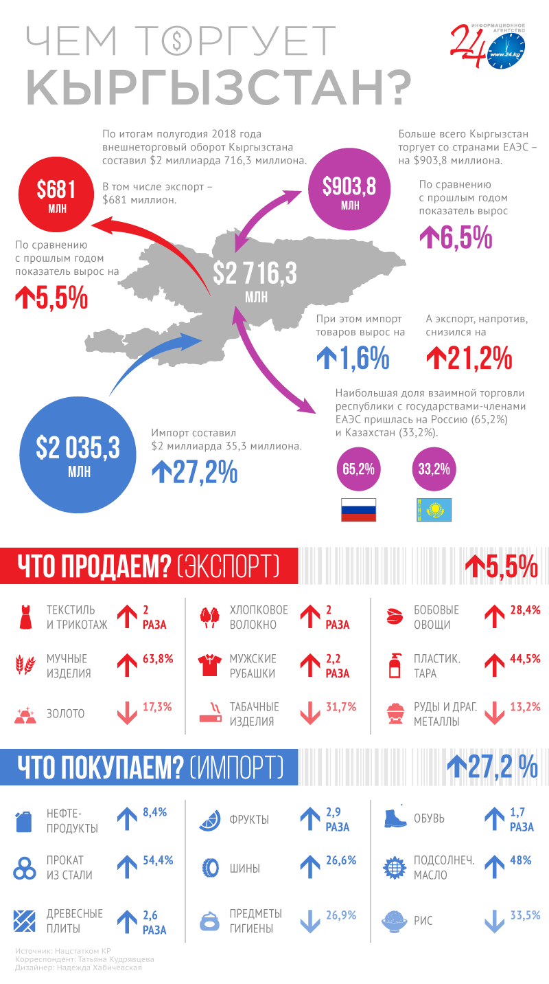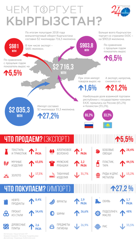 Еще более удручающие цифры наблюдаются в промышленной сфере. За полгода предприятия выпустили продукцию на 108 миллиардов 652,8 миллиона сомов. По сравнению с 2017 годом показатель сократился на 6 процентов. А ведь в прошлом году объемы роста промышленности в Кыргызстане были самыми значительными среди стран СНГ.