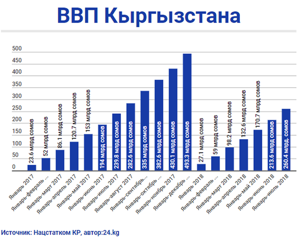 По итогам января-июля 2018 года ВВП Кыргызстана составил 260 миллиардов 457,8 миллиона сомов. По сравнению с аналогичным периодом 2017-го рост ВВП замедлился на 0,2 процента.