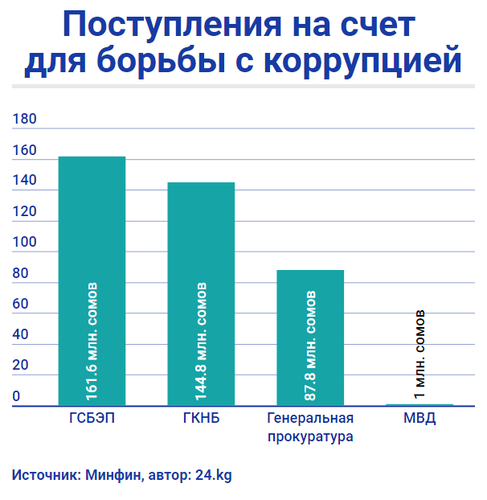 Госкомитет национальной безопасности перевел 144 миллиона 847,9 тысячи сомов. Еще 87 миллионов 881,7 тысячи сомов перечислила Генеральная прокуратура, а 1 миллион 15,5 тысячи сомов — Министерство внутренних дел.