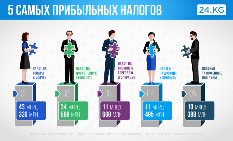 Доходы республиканского бюджета по итогам восьми месяцев 2018 года составили 84 миллиарда 366,4 миллиона сомов. Главным источником пополнения казны являются налоги — 66 миллиардов 495,4 миллиона сомов. Из них Государственная налоговая служба собрала 39 миллиардов 455,7 миллиона сомов, таможня — 27 миллиардов 39,7 миллиона сомов.