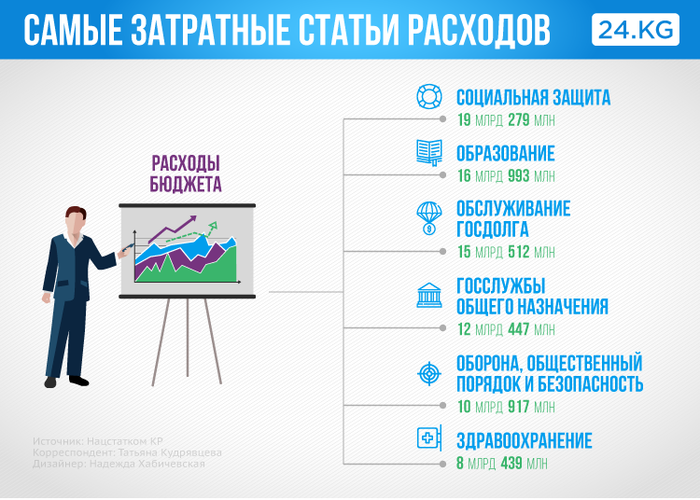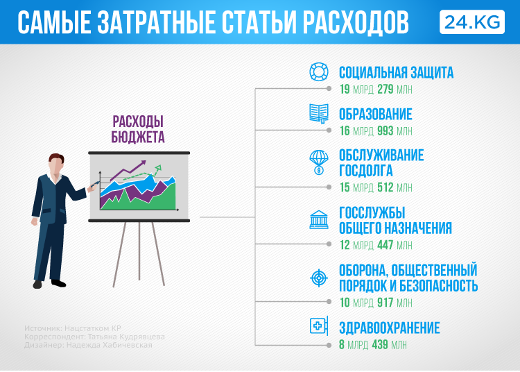 Традиционно самые большие приходятся на социальную защиту, образование и государственные службы общего назначения. Меньше всего денег выделили на охрану окружающей среды — 418,3 миллиона сомов.