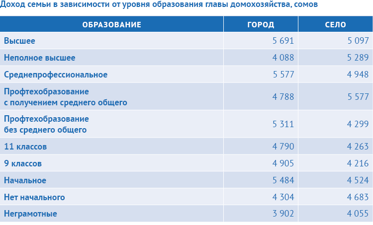 Национальный статистический комитет Кыргызстана представил данные о том, как влияет уровень образования главы семьи на доход в городах и сельской местности.