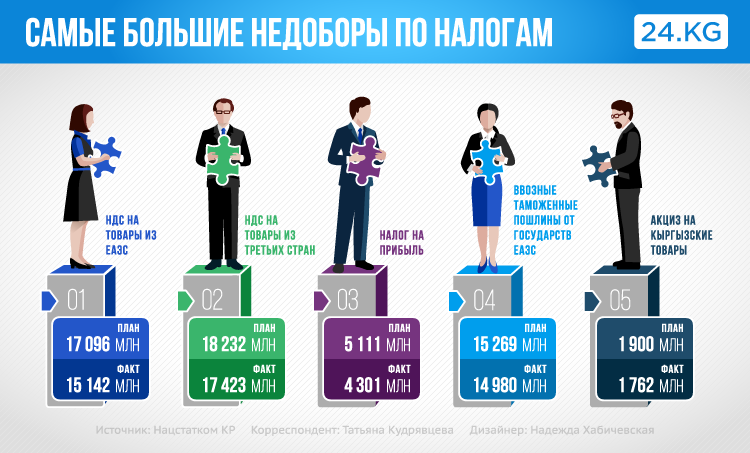 Самый большой недобор по налогам отмечен при взимании НДС — 3 миллиарда 266,8 миллиона сомов. План выполнен только по сбору НДС на товары, которые ввезли в Кыргызстан до вступления в ЕАЭС. По всем остальным видам НДС недобор.