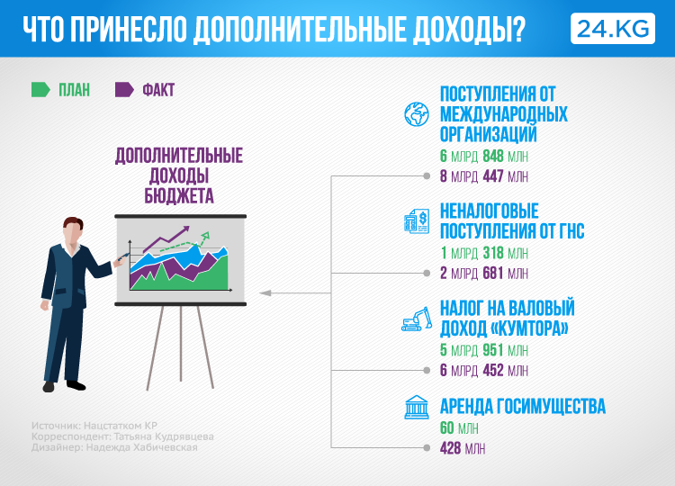 Несмотря на серьезные недоборы по налогам, разница между планом и фактом в доходной части бюджета не такая большая. Отклонение от плана составило 5 миллиардов 1 841,7 миллиона сомов. Недоборы компенсировали отдельные виды налогов, сборов и платежей, которых удалось собрать больше планируемого.