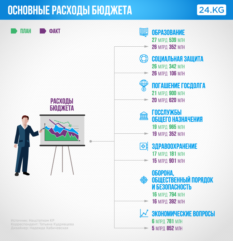 В 2017 году Кыргызстан потратил 152 миллиарда 85 миллионов сомов. Уменьшение доходов привело к тому, что чиновникам пришлось поумерить аппетиты. По сравнению с изначальным планом траты бюджета сократили на 9 миллиардов 248 миллионов сомов.