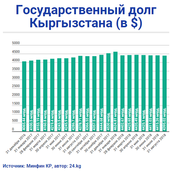 По данным Министерства финансов, на 31 августа 2018 года общий объем государственного долга составил $4 миллиарда 395,02 миллиона (303 миллиарда 361,23 миллиона сомов). В том числе $3 миллиарда 797,38 миллиона (262 миллиарда 110,05 миллиона сомов) — внешний, а $597,64 миллиона (41 миллиард 251,19 миллиона сомов) — внутренний.