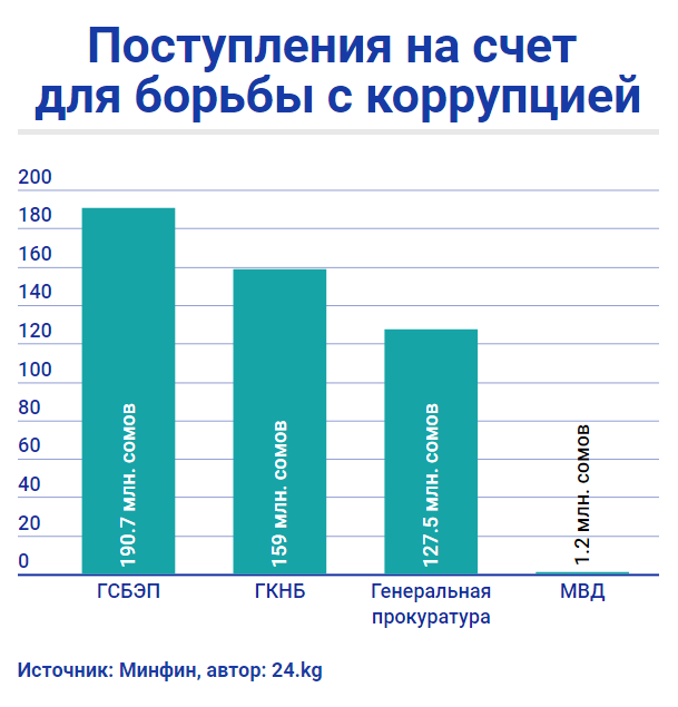 Больше всего денег перечислила Госслужба по борьбе с экономическими преступлениями — 190 миллионов 795,7 тысячи сомов. Еще 159 миллионов 64,7 тысячи сомов перечислил Госкомитет национальной безопасности, 127 миллионов 536,3 тысячи сомов — Генеральная прокуратура, 1 миллион 230,1 тысячи сомов — Министерство внутренних дел.