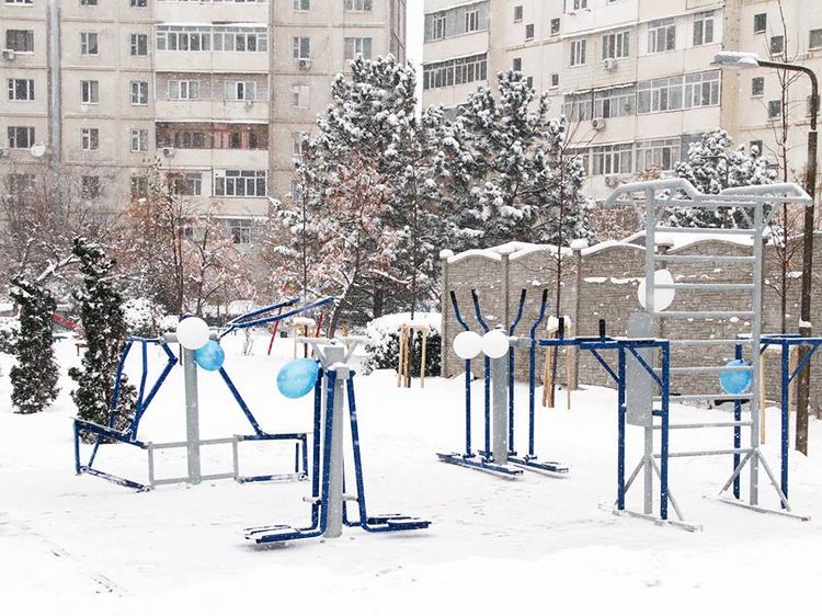 Tazalyk municipal enterprise laid paving stones, rubber covering for a playground, installed five hanging benches, litter bins, outdoor fitness equipment. Bishkekzelenhoz planted juniper, thuyas, rowans and shrubs, organized a lawn.