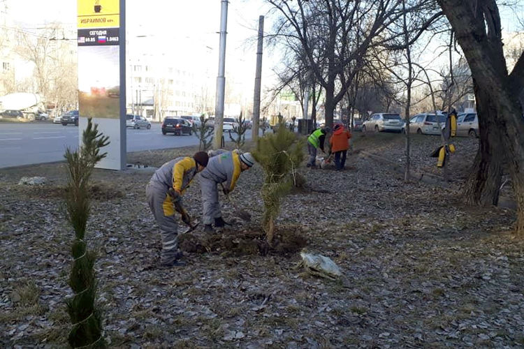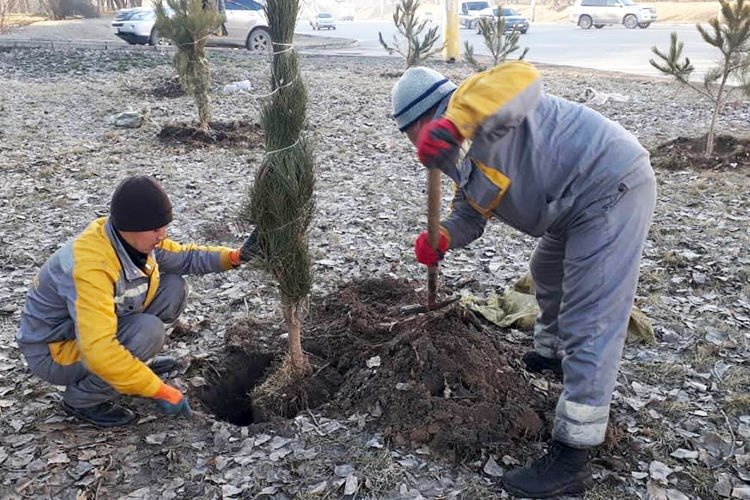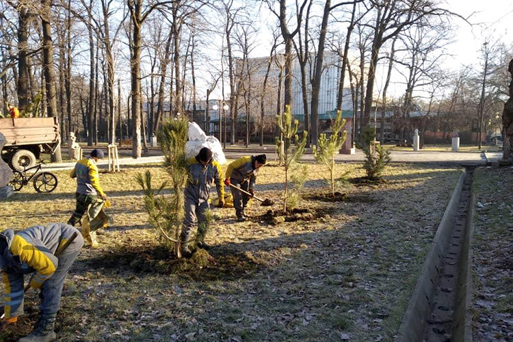 Young pine trees with a closed root system were planted in Dubovy (Oak) Park, around the circus, at the intersection of Ibraimov and Bokonbaev streets.