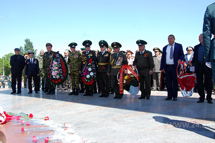 The participants laid flowers at the Eternal Flame and held a minute of silence to commemorate the deceased in the Great Patriotic War. Semirechye Cossacks participated in the ceremony of laying wreaths. By tradition, three gun salvoes sounded.