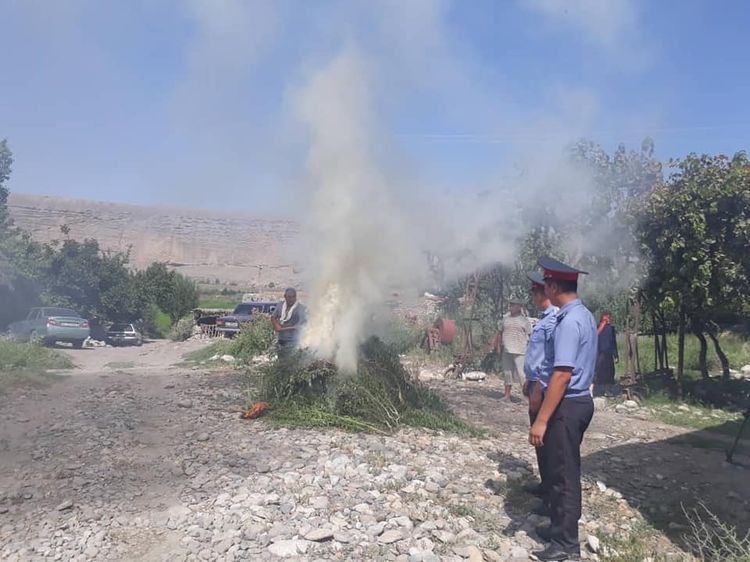 About 1.2 tons of marijuana were mowed and burned in Ak-Bulak rural district, which belongs to Kyzyl-Kiya town. The same measures were taken in Kara-Bak district, where police officers destroyed about 1.8 tons of marijuana.