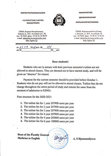 «We learned that we have to pay not 207,000 soms, as it is said in the contract at the beginning of the year, but 235,000 soms. Foreign students are at home now. We are, for example, in India and study online. The academy has been demanding payment and not conducting classes for the last two weeks,» Subhash Kumar told.