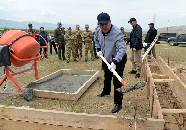 The press service of the head of state published a photo and said that during the visit, the president laid a capsule in the foundation of one of the houses of the future military town in Leilek district.