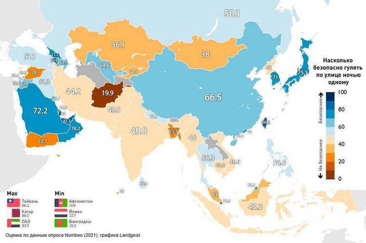 Residents of the top three countries feel completely safe: Taiwan (86.2), Qatar (86) and the United Arab Emirates (83.3).