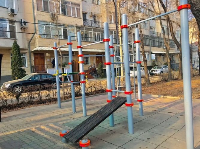 The recreation area is located next to residential buildings and public institutions. Benches, gazebos, many horizontal bars and devices for physical exercises were installed there, and a hedge was planted around the perimeter.