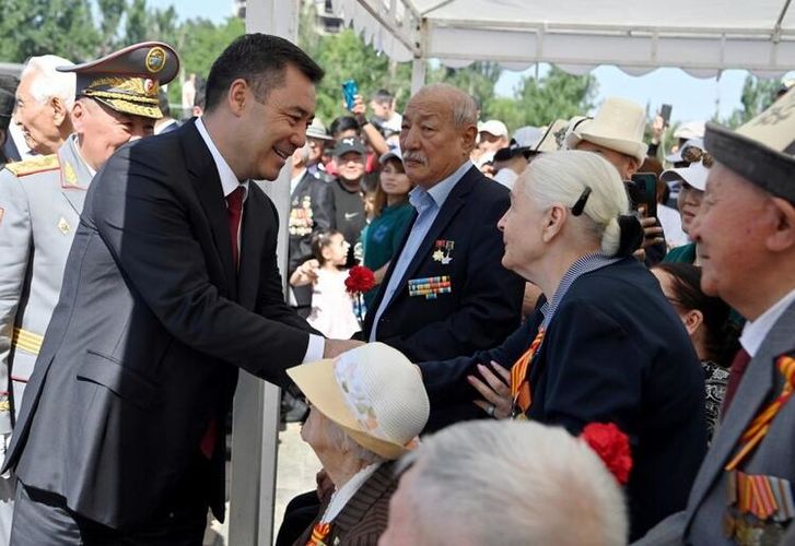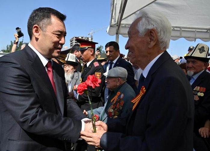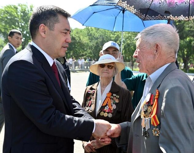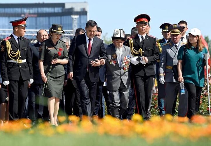 President of Kyrgyzstan Sadyr Japarov came to congratulate veterans of the Great Patriotic War and home front workers. He, along with other officials, laid flowers at the Eternal Flame and paid tribute to the memory of those killed during the Great Patriotic War with a moment of silence.