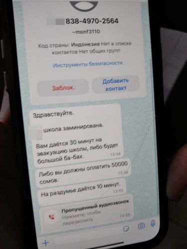 On November 14, at around 2:30 p.m., 102 service was informed that one of the teachers of a school- gymnasium on Koibagarov Street received several messages from an unknown number on WhatsApp with the text: «Hello! Your school is mined. You are given 30 minutes to evacuate or there will be a big bang. Or you must pay 50,000 soms. You have 10 minutes to think.»