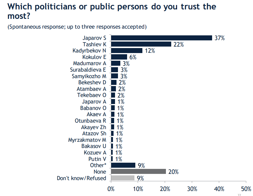 The January 2024 survey showed that 37 percent of respondents trust Sadyr Japarov most. Other 22 percent trust Kamchybek Tashiev, 12 percent — Nurzhigit Kadyrbekov. The remaining votes were distributed among 17 other politicians, including two women — Elvira Surabaldieva and Roza Otunbaeva — and the Russian leader Vladimir Putin.